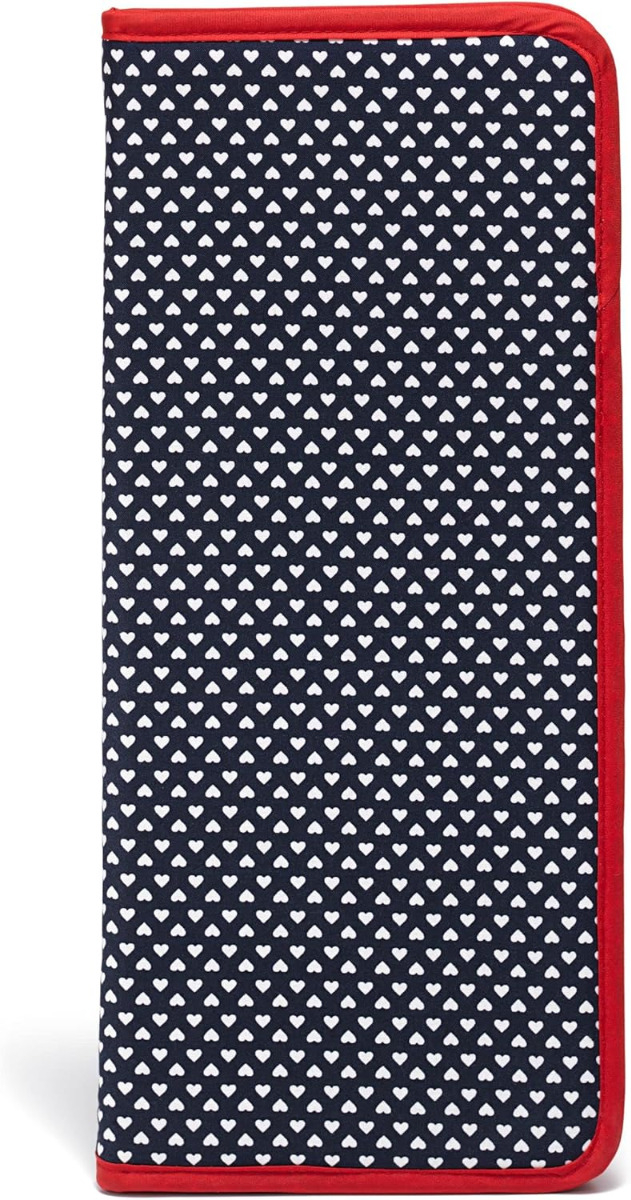 Practic si care economiseste spatiu, husa plata pentru ace de tricotat "Lovely" se prezinta si ofera mult spatiu pentru ace si accesorii de artizanat ca un ajutor perfect pentru depozitare si transport. Carcasa poate fi deschisa peste tot cu fermoar. In interiorul rosu exista cincisprezece bucle de cauciuc pentru introducerea ace de tricotat de diferite dimensiuni si tipuri. Crosetele, ace impletite si auxiliare, varfurile acelor cu franghii si alte ustensile de artizanat pot fi, de asemenea, depozitate confortabil prin opt buzunare. Designul - pur si simplu frumos! Inimile mici, albe, pe un fundal albastru inchis, inspira, in timp ce rosul de pe margini si fermoar pune aceasta husa pentru ac de tricotat cu succes in centrul atentiei.