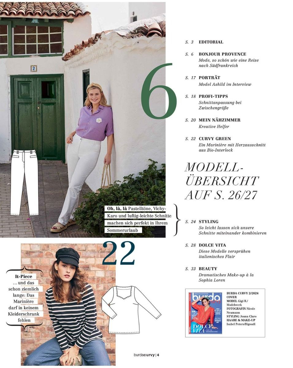 Dolce Vita sau French Chic? In aceasta editie de vara a burda curvy veti gasi croi la moda pentru vacanta, serviciu sau petrecere a timpului liber! Culori stralucitoare, imprimeuri jucause, dantela sexy, stil extravagant – vara este momentul perfect pentru a incerca ceva nou