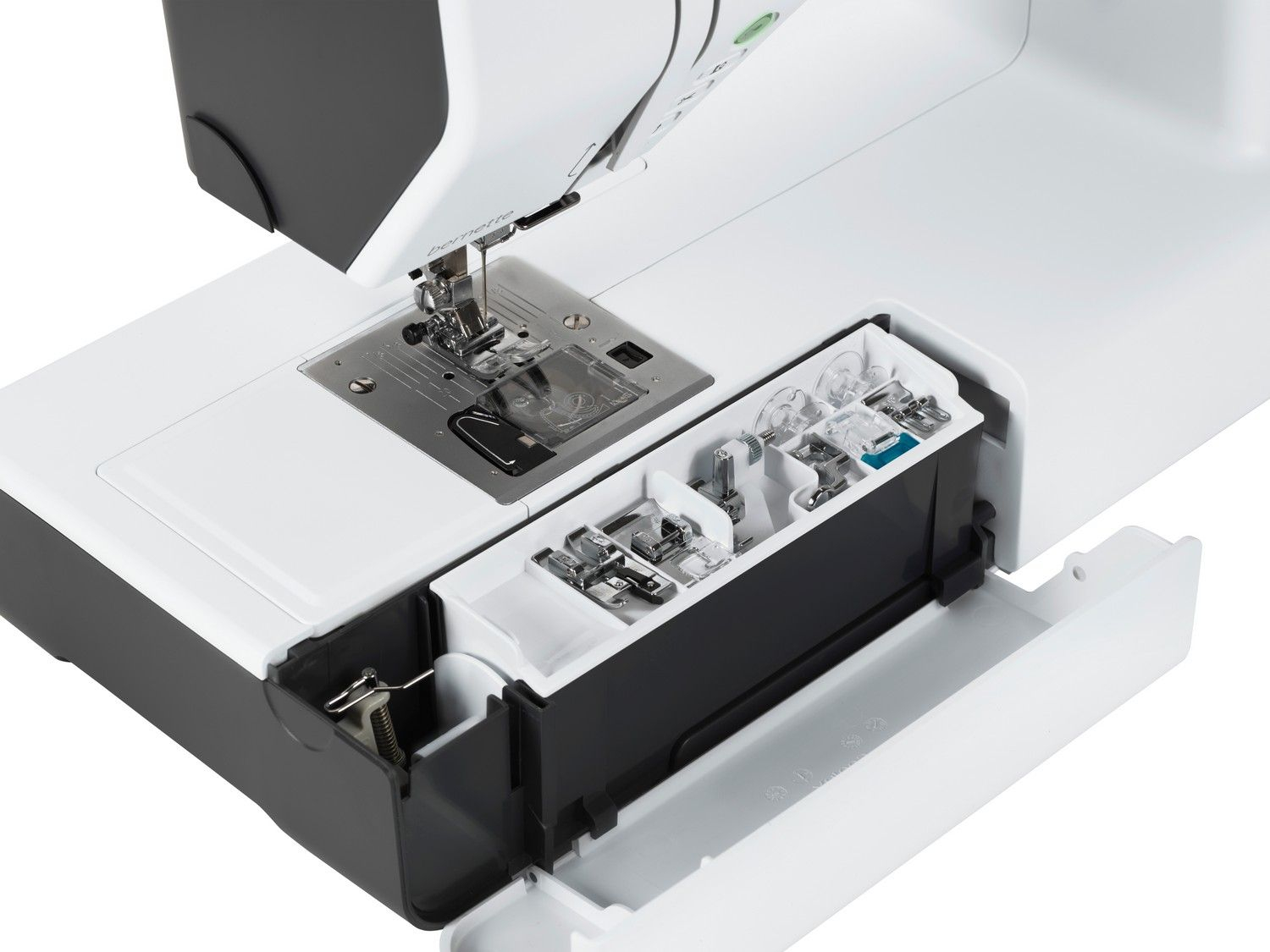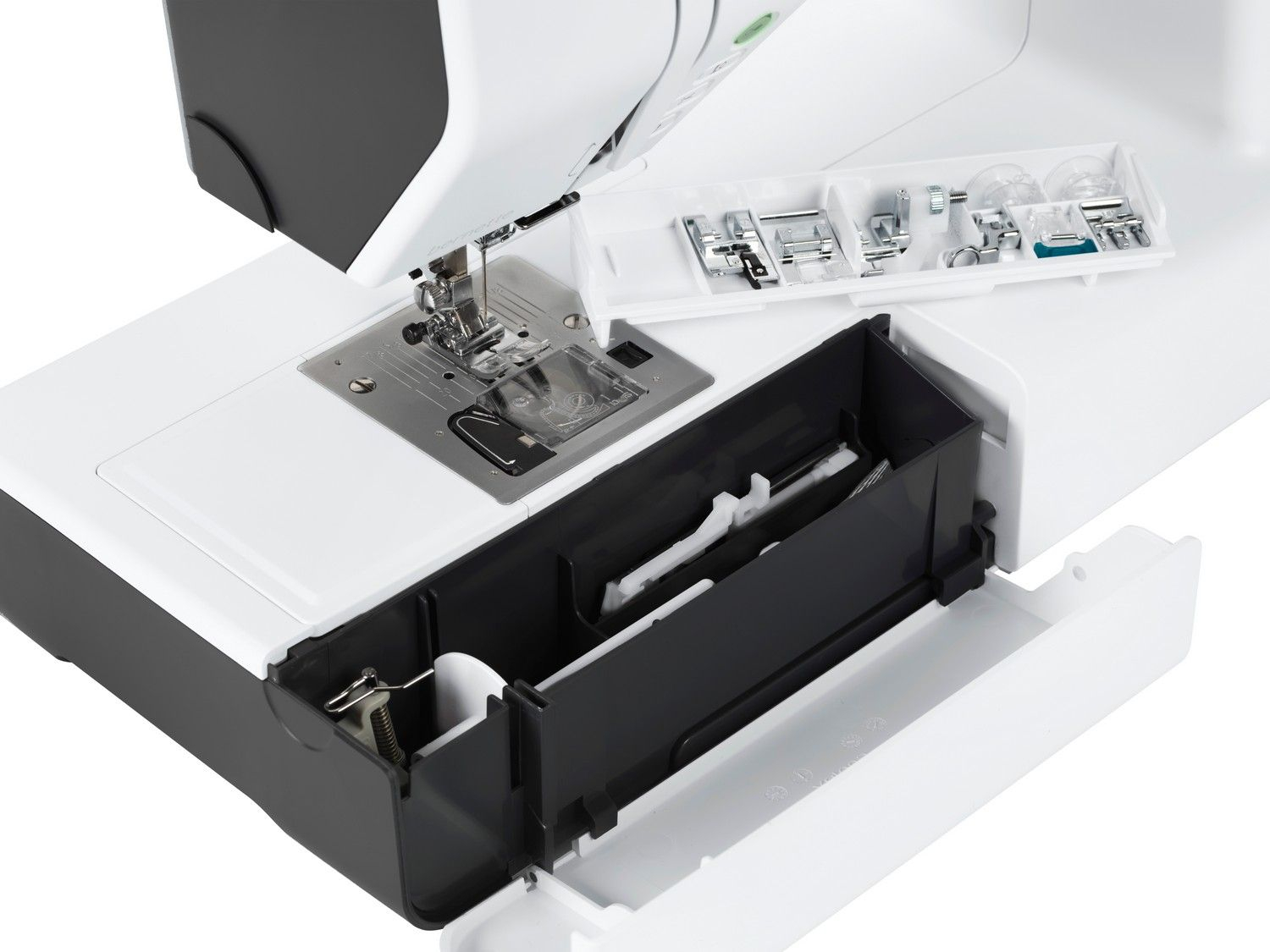 500 de cusaturi, 22 cusaturi utilitare, 133 cusaturi decorative, 17 modele butoniera, 2 cusaturi stopare, 35 cusaturi quilting (matlasare), 3 fonturi, 8 picioruse incluse, setare latime max. 5mm, setare pas max. 7mm, butoane multifunctionale: glisiera viteza, intaritura, coasere inversa, taiat ata automat, ac sus/jos, transport dual intergrat, functie de stopare, iluminare LED, ecran color 5”, functia de memorare cusaturi, buton anulare transport, ax suplimentar pentru a doua papiota, bobinator independent, genunchiera, blat de lucru cu masa detasabila, viteza maxima de coasere 1000 imp/min, pedala de picior reglabila