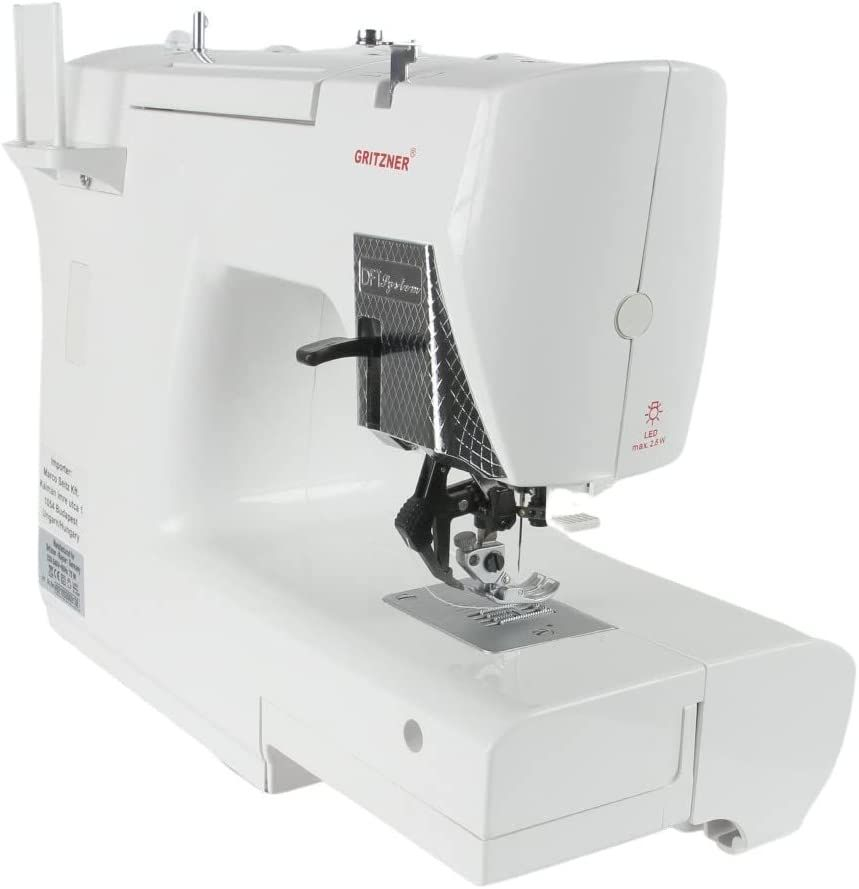 Masina de cusut GRITZNER VARIMATIC 935-IDT Heavy Duty Gritzner Varimatic 935 IDT Heavy Duty mașină de cusut cu transportor superior - 32 cusături utilitare și cusături decorative, include capac protectie 32 programe de cusut; de exemplu, cusătură dreaptă și în zig-zag, cusătură elastică oarbă, cusătură de lenjerie, întindere dreaptă și cusătură în zig-zag, cusătură peste fagure, cusătură specială overlock, cusătură overlock (închisă și deschisă), cusătură de primăvară, cusătură de perete, cusătură articulară Mașină de cusut electrică cu braț liber, filet cu ac încorporat; filetarea rapidă și ușoară a acului Butonieră automată în 4 pași; coasere ușoară a butonierei în diferite dimensiuni Lungimea variabilă a pasului (max. 4 mm) și ajustarea lățimii cusăturii (max. 5 mm), ajustarea ușoară a tensiunii firului datorită roții rotative continue Repere: transport superior încorporat pentru transportul uniform al țesăturii de sus și de jos, inclusiv capacul dur, astfel încât mașina să fie bine protejată